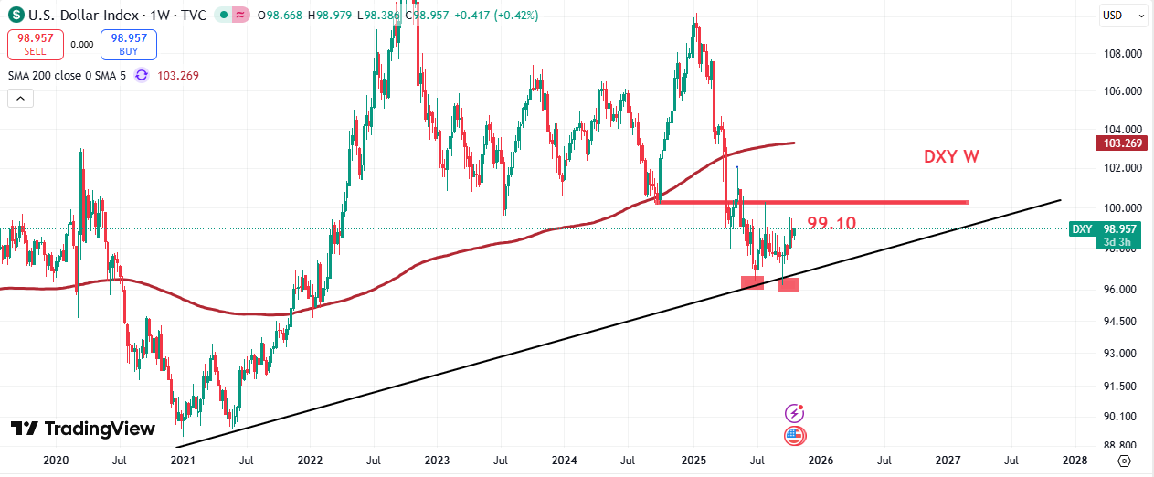 بالنظر الى مؤشر الدولار الأمريكي يبدو أن هناك نموذج قاع مزدوج على الرسم البياني الأسبوعي وهي اشارة هامة.