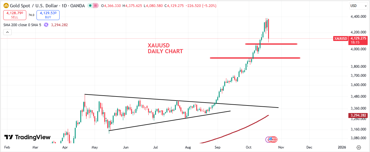 يتداول سعر الذهب دون مستوى المقاومة الهام الواقع بين 4190 و 4220 دولاراً للأونصة بعد ان كانت مستويات دعم فنية هامة ويبقى الذهب عرضة لمزيد من التحيز الدببي نحو 4000 دولاراً وربما 3950 دولار لسعر الأونصة والتي تمثل مستويات دعم قوية وهامة.