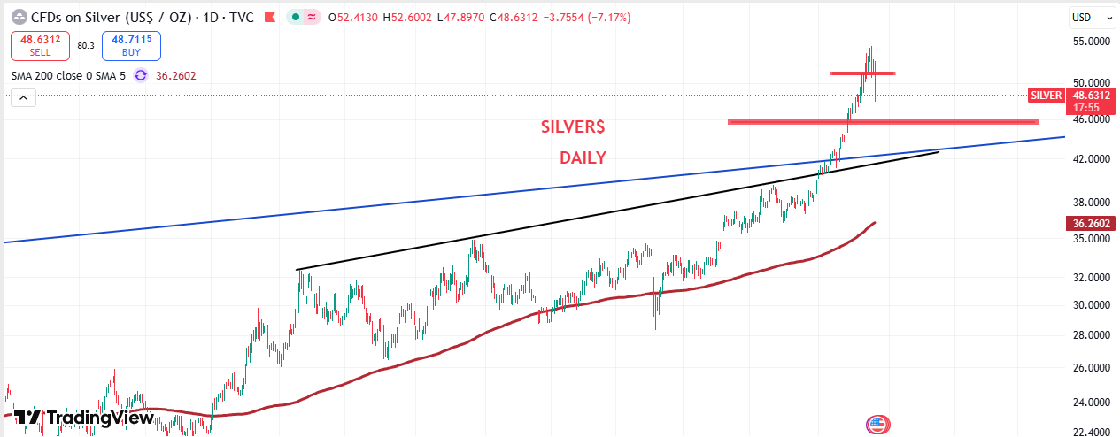 وشهدت الفضة تراجعاً كبيراً ومن المرجح أن نشهد عمليات شراء للمعدن الأبيض قرب مستوى 45 دولاراً.