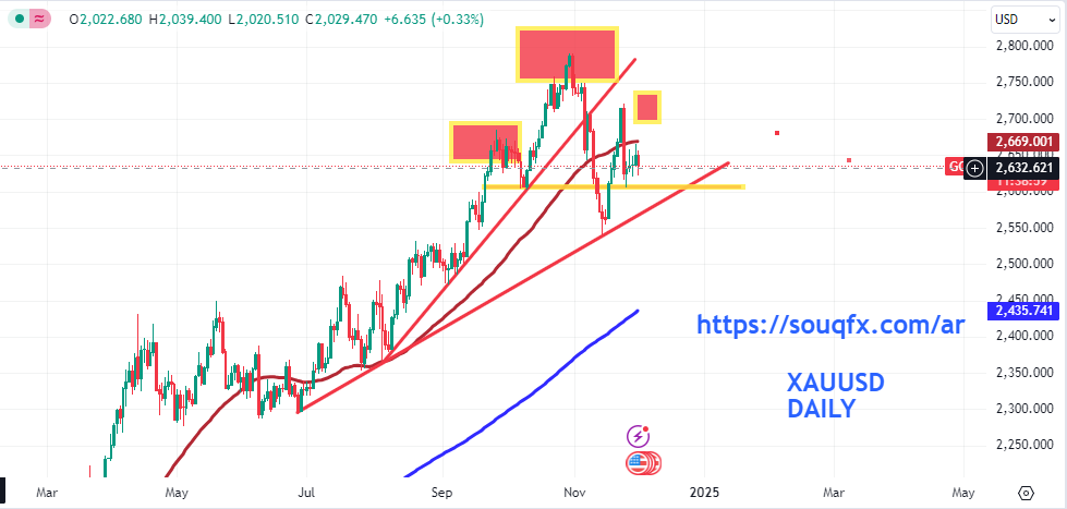 من الرسم البياني اليومي الموضح أدناه يتداول سعر الذهب الفوري دون مستوى المقاومة 2670 دولاراً للأونصة حاجز المتوسط المتحرك البسيط ل 50 يوم كما يسمونه بالتحليل الفني.